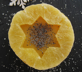 Lavamos, pelamos y cortamos en trozos la pera y el mango y lo procesamos en una licuadora. Ponemos a calentar el zumo de mandarina y cuando comience a hervir le espolvoreamos el agar agar y dejamos en el fuego unos tres minutos. Luego mezclamos con la preparación anterior y rápidamente ponemos la mezcla en moldes de silicona con forma de timbales. Dejamos enfriar a temperatura ambiente y luego refrigeramos como mínimo durante dos horas. A la hora de servir decoramos con la piña confitada y las semillas de amapola.